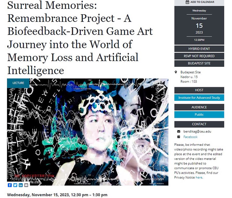 Join me at the Institute for Advanced Study, Central European University, Budapest!Discover Alzheimer's through biofeedback art and delve into my personal journey with EEG technology. RSVP with Agnes Bendik at bendikag@ceu.edu. See you there!